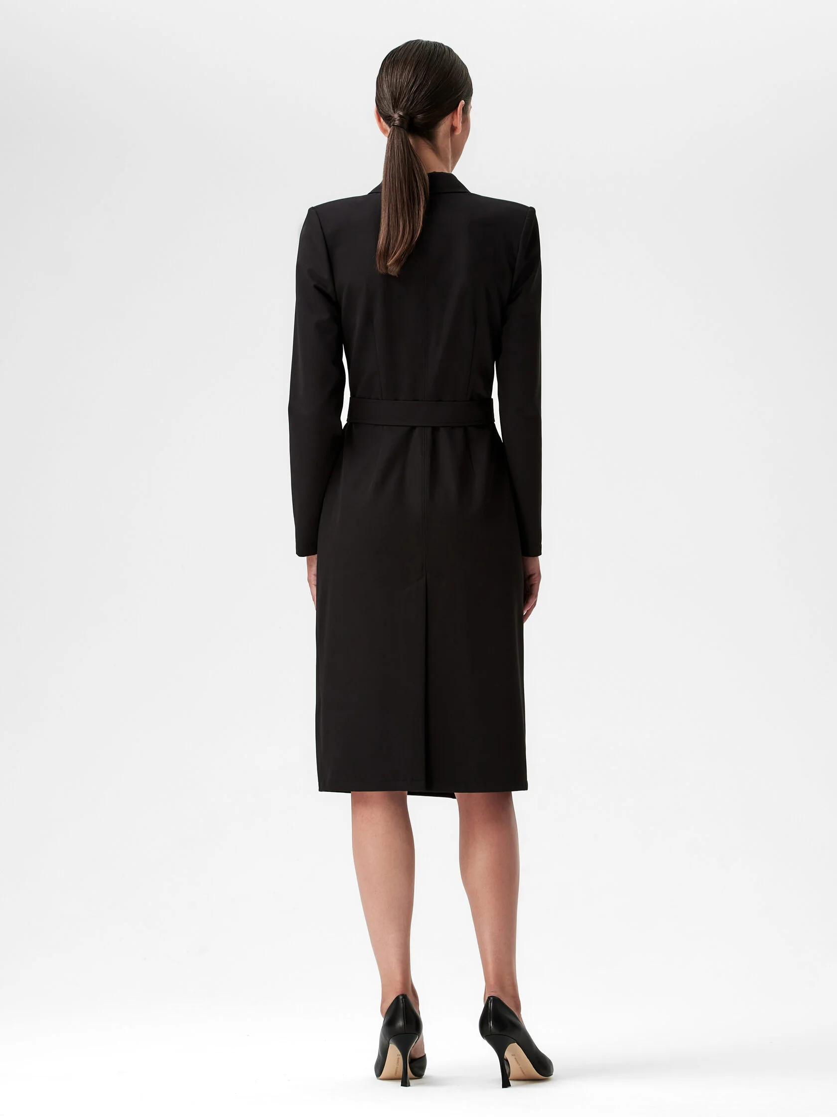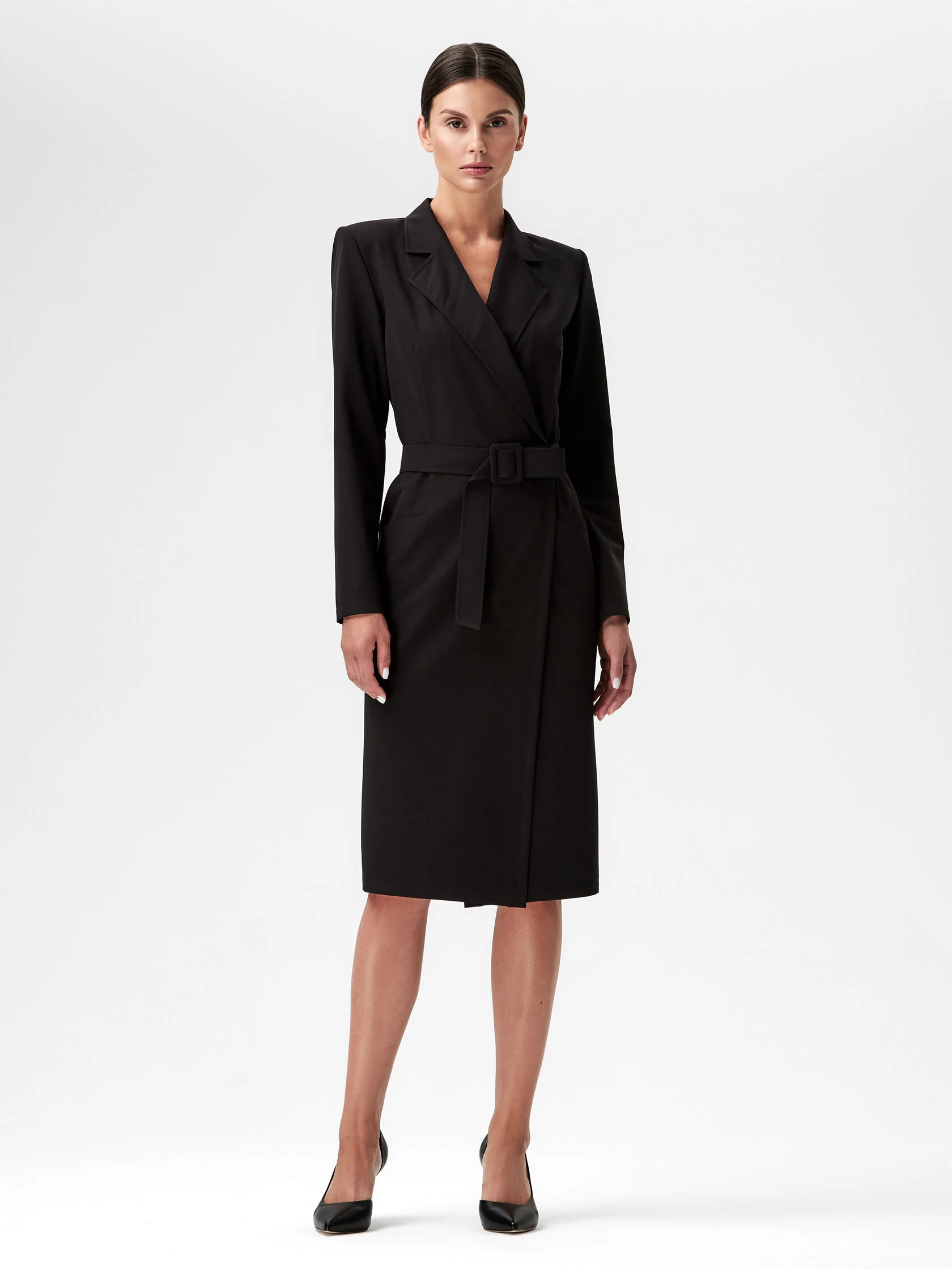 Это женское платье позволяет переосмыслить медицинский халат благодаря глубокому запаху и классическому английскому отложному воротнику. Придают образу строгости диагональная линия запаха и шлица в центральном шве сзади. Чтобы не перегружать платье деталями, в платье предусмотрена застежка с потайными кнопками. Приталенный силуэт помогает сформировать пояс с пряжкой, обтянутой тканью. Для пошива платья выбрана ткань устойчивая к сминанию и пилингуемости. Платье представлено в двух вариантах: черный и белый.