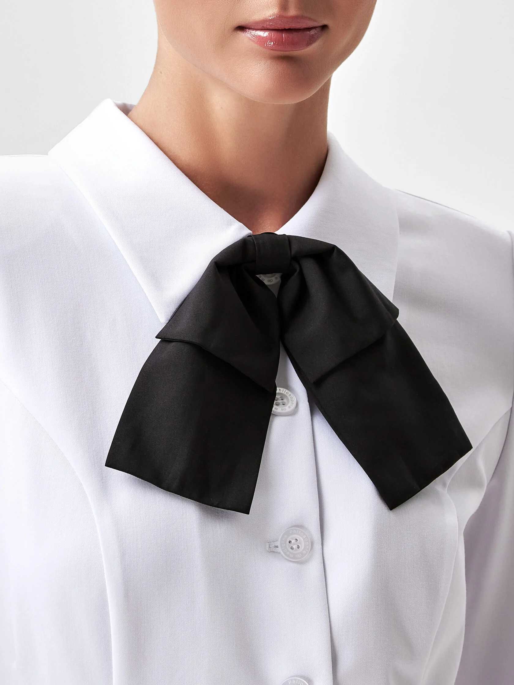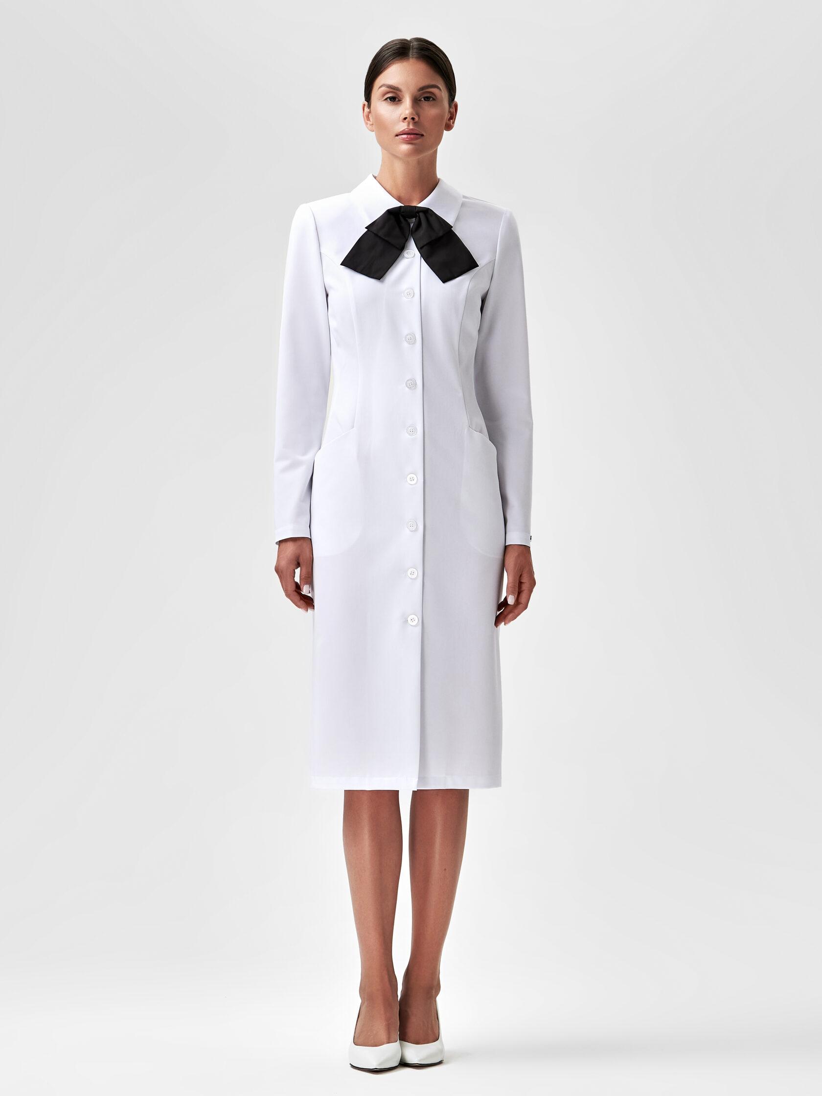 Медицинский халат может выглядеть иначе, и это женское платье с отложным воротником тому подтверждение. Образу добавляет романтичности бант, который можно отстегнуть. Приталенный силуэт подчеркивают фигурные рельефы и вытачки. Вход в карман, расположенный под определенным углом, акцентирует внимание на изящной талии. Платье застегивается на пуговицы спереди, что очень удобно.