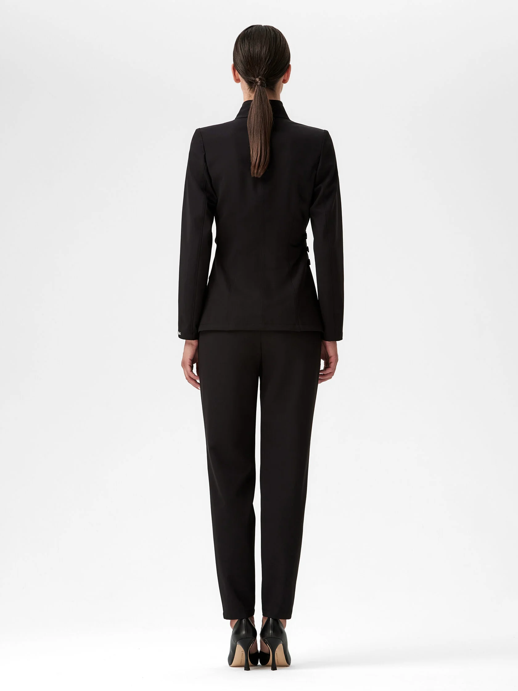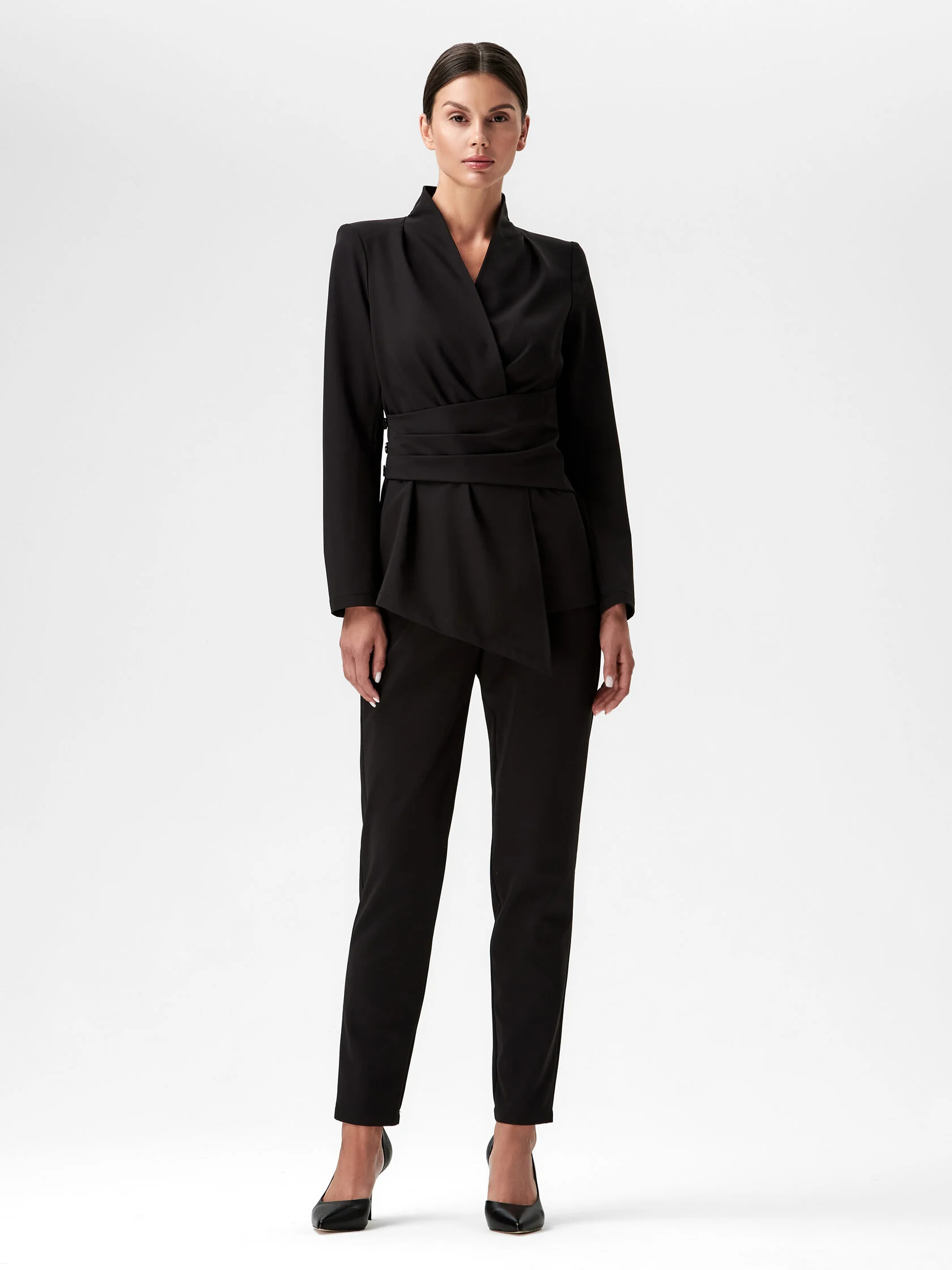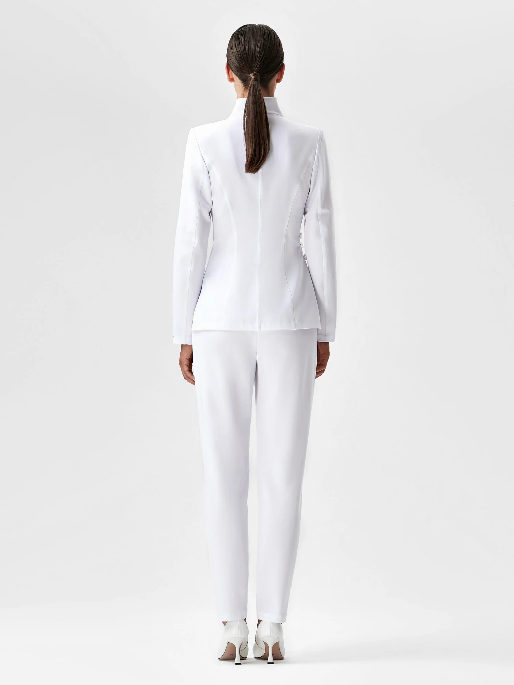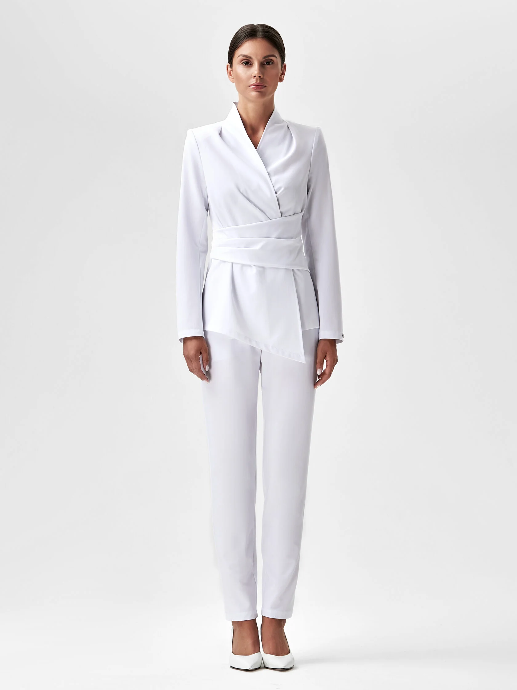 Медицинский жакет с воротником стойкой и v-образным вырезом только на первый взгляд выглядит строго. Смягчить сдержанное настроение дизайнеру удалось при помощи запаха, защипов в плечевой зоне и приталенного силуэта. Эффект «песочные часы» достигается при помощи внутренних завязок и асимметричного пояса со складками и застежкой на пуговицах. Безупречную посадку и приталивание по спинке обеспечивают центральный шов и фигурные рельефы. Асимметричный низ жакета усиливает игру контрастов. Жакет сшит из высокотехнологичного материала без подкладки.