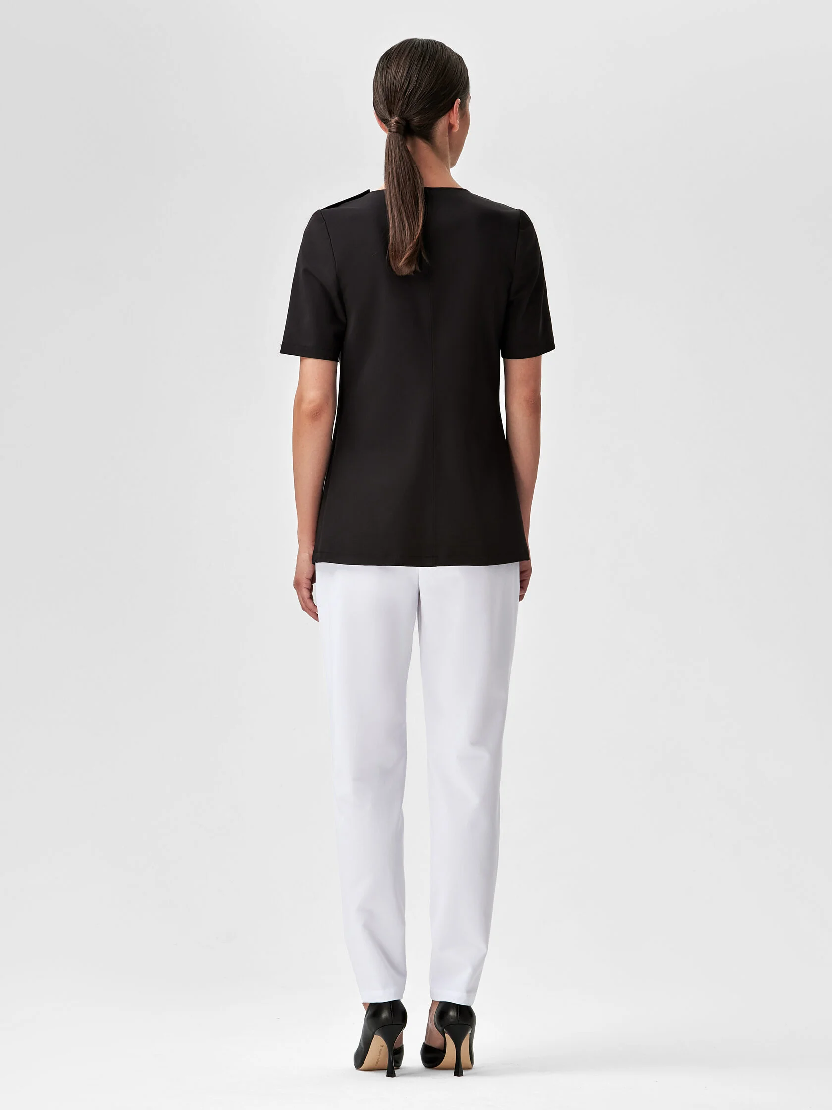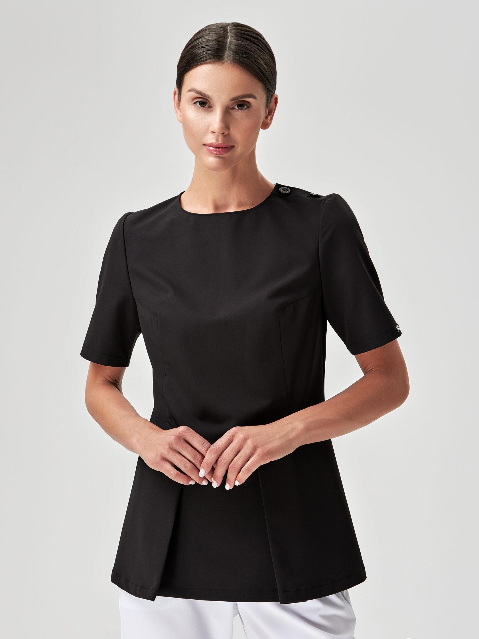 Туника полуприталенного силуэта — идеальное решение для комфортной работы. Графичный крой создаёт строгий, изысканный образ. Современная ткань с добавлением эластана обеспечивает удобство в движении и простоту в уходе. Туника прекрасно сочетается с брюками.
